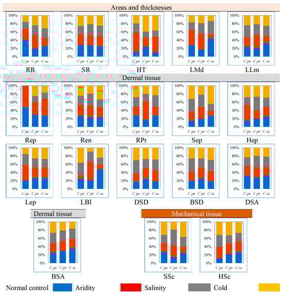 Proportion of areas, thicknesses, dermal, and mechanical tissue traits of three Cenchrus species under multiple abiotic stresses. Dermal tissue: Rep—root epidermal thickness (µm), Ren—root endodermal thickness (µm), RPr—root pericycle thickness (µm), Sep—stem epidermal thickness (µm), Hep—leaf sheath epidermal thickness (µm), Lep—leaf epidermal thickness (µm), LBl—leaf bulliform thickness (µm), DSD—adaxial stomatal density per mm2, BSD—abaxial stomatal density per mm2, DSA—adaxial stomatal area (µm), BSA—abaxial stomatal area (µm). Mechanical tissue: SSc—stem sclerenchymatous thickness (µm), HSc—leaf sheath sclerenchymatous thickness (µm). Thicknesses and areas: RR—root radius (µm), SR—stem radius (µm), HT—leaf sheath thickness (µm), LMd—leaf midrib thickness (µm), LLm—leaf lamina thickness (µm).