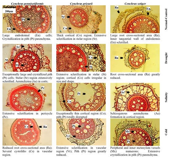 Root cross-sections of Cenchrus species under multiple abiotic stresses. Scale of measurement is given in the top left figure.