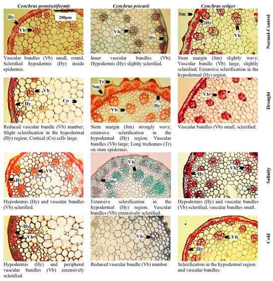 Stem cross-sections of Cenchrus species under multiple abiotic stresses. Scale of measurement is given in the top left figure.