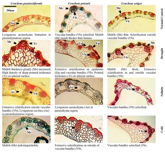 Plants of C. pennisetiformis under arid conditions were shorter in height but heavier in shoot fresh and dry weights, i.e., attained more bushy habit that is a characteristics of desert plants. Survival of this species in arid environments relied on accumulation of compatible solutes and thicker epidermis, which maintained cell turgor and minimized water loss from the plant body. Under salinity as was observed in the arid environments, this species accumulated organic osmolytes and increased proportion of storage parenchyma, critical for water conservation. Under cold environments, C. pennisetiformis increased mechanical tissue in the stem which prevented softer tissue from collapsing. Plant height was not affected in C. prieurii under abiotic stresses, while shoot biomass was higher under arid conditions and root biomass in cold environments. Leaf anatomical traits such as leaf thickness, dermal tissue, and vascular tissue were more developed in arid conditions indicating aridity as the most suitable habitat for this species. Normal-control habitats were ideal for the growth and development of C. setiger regarding leaf anatomical traits. The structural and functional modifications in Cenchrus species, such as mechanical tissues, provide structural support, while dermal and parenchymatous tissues increase water storage capacity and minimize water loss. High proportion of vascular tissues help for better conduction of water and nutrients from soil and provide mechanical strength to plant organs under stressful conditions. More importantly, increased concentration of organic osmolytes aid in turgor pressure maintenance, and ionic content (K+ and Ca2+) is crucial for better plant growth and development.