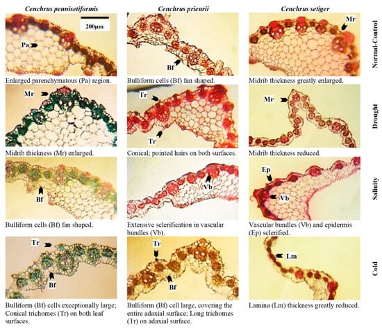 - Basharat, S.; Ahmad, F.; Hameed, M.; Naeem, M.S. Defense through foliar anatomical alterations in large spike buffel grass [Cenchrus prieurii (Kunth) Maire] against multiple environmental stresses. Pak. J. Bot. 2023, 55, 2067–2079. [Google Scholar] [CrossRef] [PubMed]