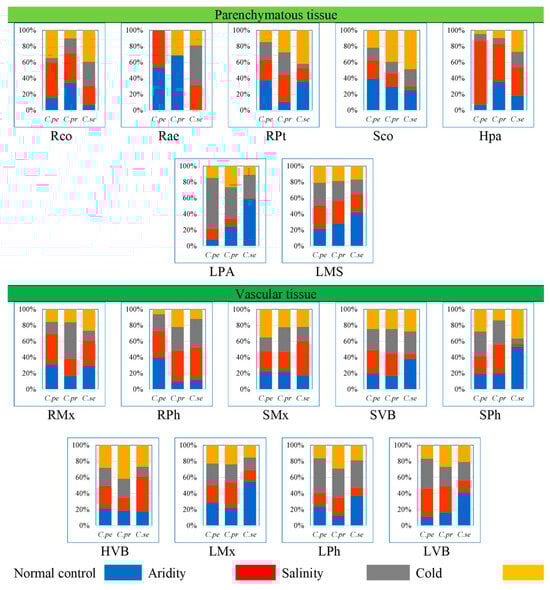 Proportion of parenchymatous and vascular tissue traits in three Cenchrus species under multiple abiotic stresses. Parenchymatous tissue: Rco—root cortical thickness (µm), Rae—root aerenchymatous area (µm2), RPt—root pith thickness (µm), Sco—stem cortical region thickness (µm), Hpa—leaf sheath parenchymatous cell area (µm2), Lpa—leaf parenchymatous thickness (µm2), LMs—leaf mesophyll thickness (µm). Vascular tissue: RMx—root metaxylem area (µm2), RPh—root phloem area (µm2), SMx—stem metaxylem area (µm2), SVB—stem vascular bundle area (µm2), SPh—stem phloem area (µm2), HVB—leaf sheath vascular bundle area (µm2), LMx—leaf metaxylem area (µm2), LPh—leaf phloem area (µm2), LVB—leaf vascular bundle area (µm2).