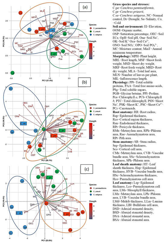 Principal component analysis showing relationship among soil/environment, morpholgy, and physiology (a), root and stem anatomy (b) and leaf sheath and leaf anatomy (c) of Cenchrus species under multiple abiotic stresses.