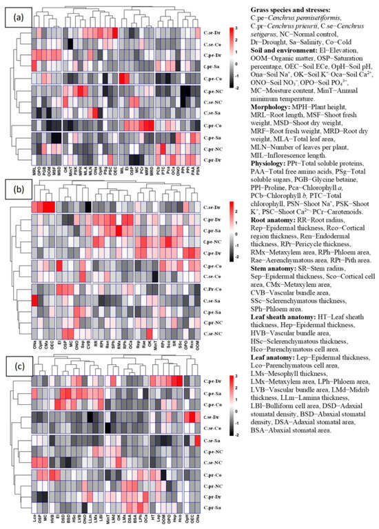 Clustered heatmap showing relationship among soil/environment, morphology, and physiology (a), root and stem anatomy (b) and leaf sheath and leaf anatomy (c) of Cenchrus species under multiple abiotic stresses.
