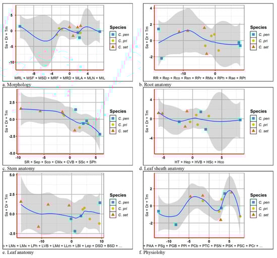 Estimated responses of different traits, i.e., morphology, root anatomy, stem anatomy, leaf sheath anatomy, leaf anatomy, and physiological traits among three Cenchrus species are presented in Figure 11. Among morphological features, a positive response of C. setigerus and C. pennisetiformis was recorded, while C. setiger responded negatively (Figure 11a). The root anatomical traits showed strong deviation, whereas only a few traits of C. pennisetiformis responded positively (Figure 11b). Stem anatomical traits showed a linear response, where C. pennisetiformis showed a positive association to climatic factors (Figure 11c). In leaf heath traits a linear trend was noted where C. pennisetiformis and C. prieurii responded positively (Figure 11d). Leaf anatomical traits showed non-linear trend and strong deviation, where C. pennisetiformis and C. prieurii responded positively (Figure 11e). Physiological traits showed a parallel trend with least deviation, where a few traits responded positively while others responded negatively (Figure 11f).