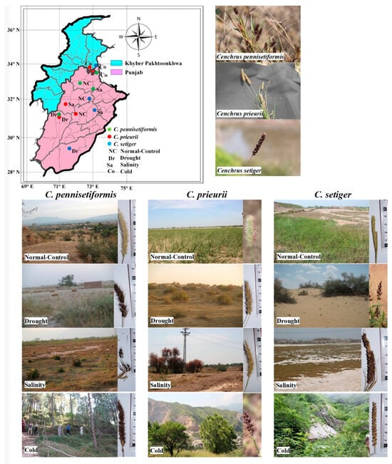 The Cenchrus species (C. pennisetiformis C. prieurii, and C. setiger) are widely distributed and can colonize different habitats through specific structural and functional alterations [30]. C. pennisetiformis and C. setiger are widespread grass species that can tolerate environmental stresses such as drought, cold and hot temperatures, waterlogging, and salinity [31]. These two species remain green under hyper-arid conditions and usually co-exist in a variety of habitats [32]. C. prieurii is a typical desert species that can tolerate drought, salinity, and cold conditions [32]. Selected grasses were collected from different stressful environments like normal (control), drought, salinity, and cold mountainous region.