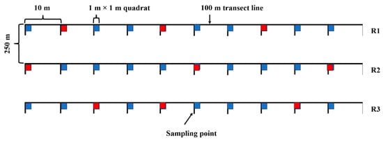 The plant samples were collected carefully with soil auger (20 cm dia.) and preserved in plastic zipper bags. The material was then kept in an icebox for further physiological and anatomical analysis in the laboratory. Sampling layout is presented in Figure 13. Ten quadrats (1 m × 1 m) were placed along a transect line (100 m) at each study site keeping in view where the pure community of each species existed. This made the maximum probability (about 95%) of the existence of a plant in each quadrat as mentioned in Figure 3. If a plant was absent from a particular quadrat then the adjacent quadrat was selected. Three quadrats were selected at each study site for morphological, anatomical, and physiological studies (indicated by red colour in Figure 13). One plant within each red quadrat was selected. Three transect lines (replications) were positioned at each habitat, each separated by 250 m. Data of three plants were then averaged for each replication, and then used in the analyses of different traits (Figure 13). The vegetation analysis was conducted from all 10 quadrats laid at each transect line, which is not presented in the present study.
