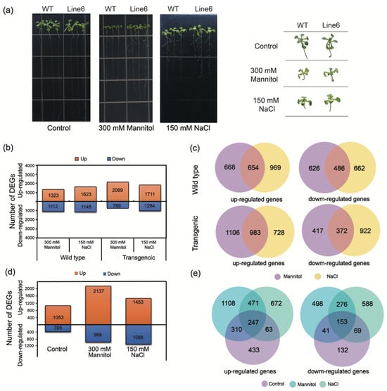 The DEGs analysis between overexpression-ScDREB10 and WT Arabidopsis transcriptomes in response to osmotic and salt stresses. (a) The phenotype of overexpression-ScDREB10 in response to osmotic and salt stresses; (b) the total number of up- and down-regulated genes of WT and transgenic lines under osmotic and salt stress treatments compared to control; (d) the total number of up- and down-regulated genes of ScDREB10 line compared to WT under control, osmotic and salt stress treatments; (c,e) Venn diagram showing overlap of up- and down regulated genes analysis between overexpression-ScDREB10 and WT under control, osmotic or salt stresses corresponding to (b,d). Genes with adjusted p value (FDR) < 0.05, and |log2 fold change| > 1 were listed as significant DEGs.