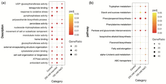 The results of GO enrichment and KEGG pathway analysis for up-regulated DEGs between overexpression-ScDREB10 and WT transcriptomes in response to osmotic and salt stresses. The figure includes the GO enrichment analysis (a) and KEGG pathway analysis (b) results. The X-axis displays the GeneRatio, while the Y-axis represents the terms of pathways. The coloring in the figure is correlated with the padj value, where a lower padj value indicates a more significant enrichment. Additionally, the point size in the figure correlates with the numbers of DEGs.