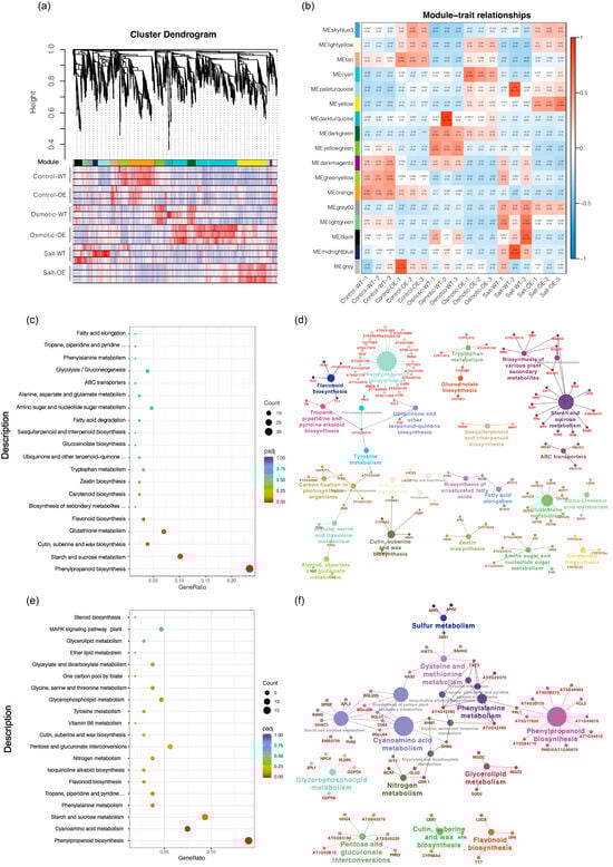 WGCNA analysis to assess all DEGs between the overexpression-ScDREB10 and WT transcriptomes in response to osmotic and salt stresses. (a) A hierarchical cluster tree was generated to identify co-expression modules through WGCNA. Each leaf on the tree represents an individual gene. The tree consists of 17 modules, which are labeled with different colors. (b) Heatmap of the relationships between module traits and different lines subjected to various treatments. Each row in the table corresponds to a consensus module, labeled with a color as shown in (a), and each column represents a repeat line under different treatments. (c) KEGG pathway enrichment analysis was performed for the cyan module. (d) Gene network based on the KEGG pathway enrichment analysis for the cyan module. (e) KEGG pathway enrichment analysis of yellow module. (f) Lastly, a gene network was generated based on the KEGG pathway enrichment analysis for the yellow module. The x-axis represents the GeneRatio, while the y-axis represents the terms of pathways. The coloring of the plot corresponds to the padj value, where a lower padj value indicates a higher significance of enrichment. The size of the points in the plot correlates with the number of DEGs.