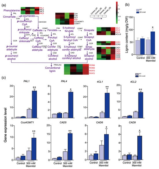 The expression of lignin biosynthesis pathway in overexpression-ScDREB10 lines and the WT under osmotic stress. (a) The pathway and heat map analysis of lignin biosynthesis of overexpression-ScDREB10 and WT. The heat map analysis revealed that genes in overexpression-ScDREB10 lines were either upregulated (represented by red bars), not significantly changed (represented by black bars), or downregulated (represented by green bars) under osmotic stress. Red markings indicated significantly increased gene expression levels in overexpression-ScDREB10 lines compared to WT under osmotic stress. The heat map was constructed using TB Tools [28]. (b) qRT-PCR of overexpression-ScDREB10 and WT under normal conditions and osmotic stress treatment. The WT samples were represented by a light blue box, while the transgenic line 6 samples were represented by a deep blue box. AtUBQ10 and AtTubulin served as reference genes for normalization as described by Choi et al. (2014). The relative gene expression levels were calculated using the 2−ΔΔCt method (Livak and Schmittgen, 2001 [29]) and presented as fold change (FC) compared to the control, which was set at 1. Statistical significance was determined by LSD (* p < 0.05, ** p < 0.01). (c) The lignin content of overexpression-ScDREB10 and WT under normal conditions and osmotic stress treatment.