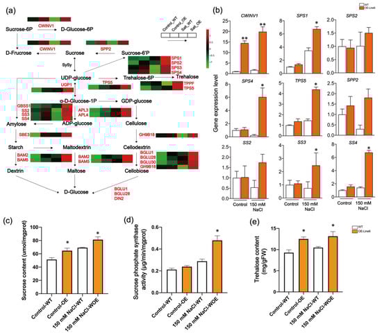 The starch and sucrose metabolism of ScDREB10-OE lines and WT under salt stress. (a) Heatmap of expression level of genes that are involved in the starch and sucrose metabolism and are distinctly expressed in overexpression-ScDREB10 Arabidopsis compared to WT plants. The red and green color indicate up- and down-regulated DEGs, respectively; (b) qRT-PCR of overexpression-ScDREB10 and WT under normal condition and salt stress treatments; the sucrose content; (c) sucrose phosphate synthase activity (d) and trehalose content (e) of overexpression-ScDREB10 and WT under normal conditions and salt stress treatments; White box indicates the WT and orange box represents the transgenic line 6. AtUBQ10 (At4g05320) and AtTubulin (At1g50010) were used as reference genes for normalization (Choi et al., 2014). The FC in relative gene expression level was evaluated utilizing the 2−ΔΔCt approach, as described by Livak and Schmittgen (2001) [29], with control values set at 1. The statistical significance (* p < 0.05, ** p < 0.01) was determined using the LSD test.