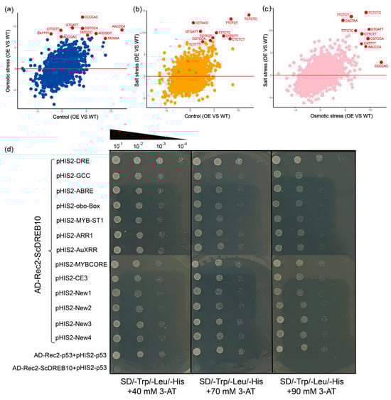 The cis-acting promoter element analysis of ScDREB10 in response to osmotic and salt stresses. (a–c) The cis-acting promoter element analysis of ScDREB10 in response to osmotic and salt stresses by transcriptome; the hexamer sequence frequencies of up-regulated genes in ScDREB10 were compared to standardized promoters using scatter plots. The number of hexamer sequences was calculated and standardized for every 100 promoters in three comparisons: osmotic stress OE vs. WT vs. control OE vs. WT, salt stress OE vs. WT vs. control OE vs. WT, and osmotic stress OE vs. WT vs. salt stress OE vs. WT. Cis-acting promoter element sequences marked by red indicated the 10 most-frequent hexamers identified among three comparisons; (d) determination of the ability of ScDREB10 to bind cis-acting promoter elements by yeast one-hybrid assay. Triple tandem copies of 13 representative cis-element sequences (DRE, GCC, ABRE, obo-Box, MYB-ST1, ARR1, AuXRR, MYBCORE, CE3, New1, New2, New3 and New4) were used as baits. Yeast cells carrying pGADT7-ScDREB10 and 13 pHIS2-cis-acting elements were plated on SD/-Trp/-Leu/-His dropout medium with 40 mM, 70 mM, and 90 mM of 3-AT, respectively. PGADT7-p53 binding to pHIS2-p53 (AD-Rec2-p53 + pHIS2-p53) was used as a positive control, while AD-Rec2-ScDREB10 and pHIS2-p53 were used as negative controls.