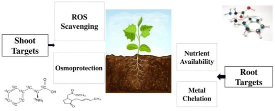 Amino acids are also important in the agriculture industry as chelates of metal ions and microelements chelated with amino acids from very small, electrically neutral molecules increase their transport and absorption within the plant [,,]. Some of the most important products in the market which contain amino acids are Delfan Plus (Tradecorp, Madrid, Spain), Natural Crop SL (Natural Crop Poland Sp. Z o.o., Warsaw, Poland), Bosfoliar Activ (COMPO EXPERT, Munster, Germany), Amino Quelant Ca (Bioiberica, Barcelona, Spain), Tecamin Max, Tecamin Brix, Tecnokel Amino Mix, Terra-Sorb Foliar (Agritecno Fertilizants, Valencia, Spain), Agrocean B (Agrimer, Plouguerneau, France), Metalosate Calcium and Metalosate Fe (Albion Minerals, Layton, UT, USA) [,,,]. The usage of amino acids can increase co-enzyme formation and the photosynthesis procedure [], and supports different plant organisms that may face environmental stresses []. It has been also reported that the exogenous utilization of amino acids can enhance nitrogen status, and the contents of mineral elements in plant tissues [,]. Depending on environmental conditions and plant species, plants reduce inorganic nitrogen to amino acids in roots, nodules, and leaves [,,]. Many studies have reported the important and notable effects of the foliar application of concentrations with phenylalanine and tyrosine solutions on essential oil, the total amount of phenols, and their compositions in Ocimum basilicum L., Melissa officinalis L., and Coleus blumei L. plants [,,]. Phenylalanine is an amino acid [,], and its foliar application can help mustard (Brassica campestris L.) plants overcome drought stress and increase total chlorophyll contents, shoot length, and biological yield []. Roman et al. [] reported that foliar application of methyl jasmonate and phenylalanine can increase the content of volatile compounds in grapes, and Portu et al. [] introduced it as an important management tool for boosting grape quality. The impacts of different amino acids on several experimental plants are shown in Table 1. The roles of different amino acids as biostimulants are shown in Table 2. The main mechanisms of amino acids biostimulants are shown in Figure 1.