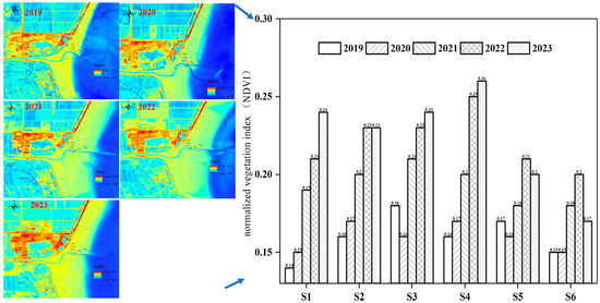 In order to monitor the changes in vegetation restoration in the restoration area, we selected the month of August as the monitoring period. This is because the most luxuriant growth of Suaeda salsa takes place during August. The normalized vegetation index (NDVI) for this study area was analyzed (Figure 1). The changes in NDVI from 2019 to 2023 are shown in Figure 1. In 2019, the NDVI of the restoration area was 0.14 to 0.18, and the areas with the most luxuriant growth were located at stations S3 and S5. The lowest NDVI was observed at the supratidal station (S1) and the station closer to seawater (S6), with vegetation indexes of 0.14 and 0.15, respectively. In 2020, the vegetation in the restored area did not change significantly due to a disturbance from ecological restoration activities. In 2021 and 2022, as the ecologically restored vegetation entered the self-sustaining stage, the NDVI showed a significant increase, with an average growth rate of 0.03/a. In 2023, the vegetation index of the restored area was increased to 0.17~0.26, and the stations with more luxuriant growth changed to S1–S4. The average NDVI increased to 0.22 ± 0.03, and the lush vegetation area expanded. The area with the least vegetative growth changed from S1 to S6. It was also observed that the artificial vegetation ecological restoration project in the coastal zone played a certain role in the restoration of coastal vegetation habitats. From 2019 to 2023, the total vegetation index of the restoration area increased from 0.96 to 1.34, with an annual rate of increase of 0.08/a. However, the RSD change relative to changes in the index of the different zones reduced from 8% to 5% and then increased to 13%, indicating a clear differentiation in vegetation restoration after self-sustainment.