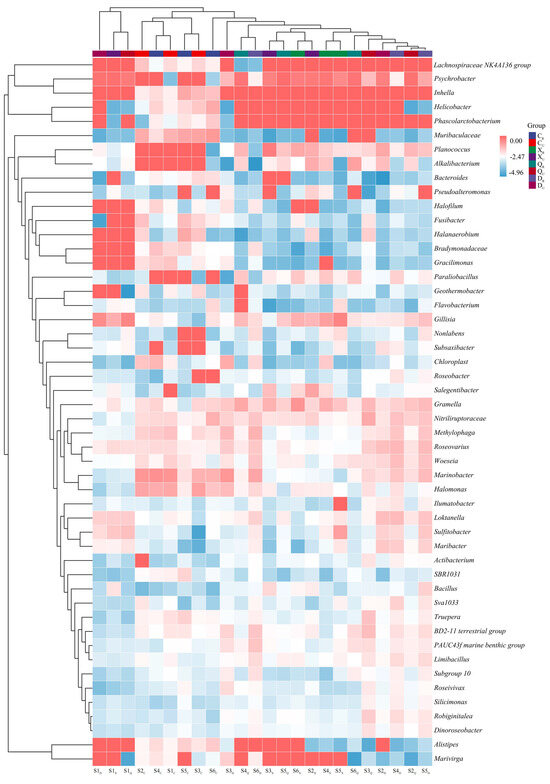 High-throughput bacterial assays revealed (Figure 2) that the spring restoration area was dominated by Marinobacter (1.08–20.27%), Halomonas (0.72–10.88%), Inhella (0.63–8.60%), and Muribaculaceae (1.14–10.21%). In the summer, it was dominated by Psychrobacter (27.21–65.74%), Gillisia (0.21–33.33%), Gramella (1.04–17.98%), and Planococcus (0.14–40.82%). In the autumn, it was dominated by Psychrobacter (3.88–73.51%), Planococcus (0.34–4.93%), Gillisia (0.66–4.46%), and Gramella (0.27–8.87%). In the winter, it was dominated by Marinobacter (0.07–16.66%), Methylophaga (0.22–5.66%), Woeseia (0.30–3.99%), Roseovarius (0.67–4.95%), and Loktanella (0.45–4.16%). However, there were still differences between sampling sites.