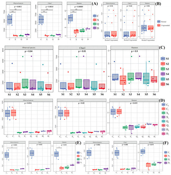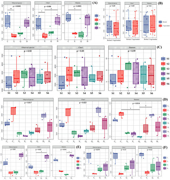 α diversity of archaea in the study area. (A) Samples of different seasons; (B) Samples of vegetative/no-vegetation zone; (C) Samples in different sites during the year; (D) Samples of different seasons in vegetative/no-vegetation zone; (E) Samples of different seasons in vegetative zone; (F) Samples of different seasons in no-vegetation zone. S1: Supratidal no-vegetation zone; S2: supratidal vegetative zone; S3: intertidal vegetative zone; S4: intertidal no-vegetation zone in the Yongfeng River Estuary; S5: intertidal vegetative transition zone in the Yongfeng River Estuary; S6: intertidal vegetative zone in the Yongfeng River Estuary. C: Spring; X: summer; Q: autumn; D: winter. R: Vegetative zone; U: no-vegetation zone. The * means p < 0.05 and ** means p < 0.01.