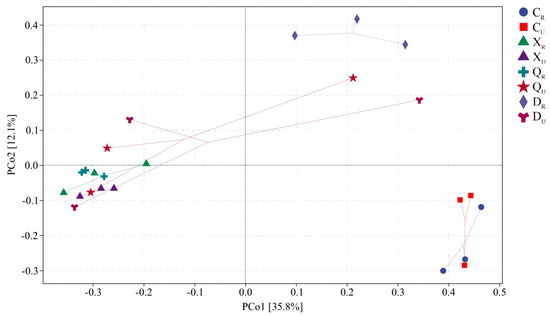 Via PCoA analysis (Figure 6), the total explained amount of differences in bacterial communities between samples was 47.9% on the first and second principal axes. The differences between spring samples and other samples, between winter-rooted areas and summer samples, and between different autumn-rooted areas were mainly reflected on the first principal axis with an explanation of 35.8%. The differences between winter-rooted areas and different samples of non-statistical seasons and the differences between spring and other season samples were reflected in the second main coordinate axis with an explanation of 12.1%. Meanwhile, there were three relatively separated zones in the vertical direction, i.e., the second coordinate axis, throughout the PCoA analysis—namely, the winter-rooting zone samples; the other samples during summer, autumn, and winter; and the spring samples. This result suggests that there is a large difference between the bacteria in spring surface soil and the other seasonal samples and that rooting or not rooting has a weaker effect on soil bacteria in spring. Rooting in winter had a greater effect in terms of surface soil bacterial communities, and the seasonal effect was not as pronounced as the effect of rooting in terms of surface soil. Therefore, surface soil bacteria were affected by both seasonal and rooting conditions, but more so by seasonal effects.