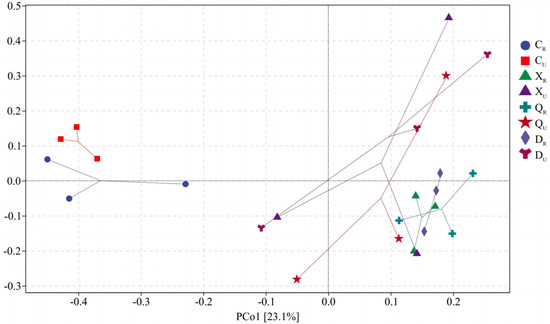 Principal coordinates analysis for bacteria. S1: Supratidal no-vegetation zone; S2: supratidal vegetative zone; S3: intertidal vegetative zone; S4: intertidal no-vegetation zone in the Yongfeng River Estuary; S5: intertidal vegetative transition zone in the Yongfeng River Estuary; S6: intertidal vegetative zone in the Yongfeng River Estuary. C: Spring; X: summer; Q: autumn; D: winter. R: Vegetative zone; U: no-vegetation zone.