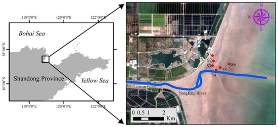 The study area in the Bohai restoration project. The red dots denote the monitor station. S1: Supratidal no-vegetation zone; S2: supratidal vegetative zone; S3: intertidal vegetative zone; S4: intertidal no-vegetation zone in the Yongfeng River Estuary; S5: intertidal vegetative transition zone in the Yongfeng River Estuary; S6: intertidal vegetative zone in the Yongfeng River Estuary.