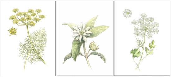 - Guenther, E. Chapter V: Essential Oils of the Plant Family Umbelliferae. In The Essential Oils, Vol. IV; Robert E Kreiger Publishing Co., Inc.: Huntington, NY, USA, 1952; pp. 568–569. [Google Scholar]