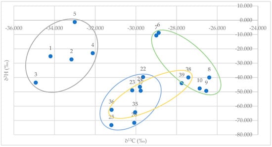 Samples were analyzed in triplicate to ensure repeatability. δ2H values are reported with a standard deviation ≤ 2.0‰ and δ13C values are reported with a standard deviation ≤ 0.2‰.