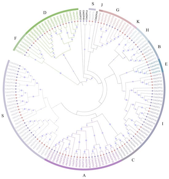 A. thaliana is one of the earliest plants studied for the bZIP TF family, holds significant reference value, and is commonly employed as a model genetic plant for plant gene research [3,7]. To gain a deeper understanding of the evolutionary properties of CebZIP family members, a phylogenetic tree was constructed by combining 70 CebZIPs with 78 AtbZIPs (Figure 1) [7]. Following the classification method used for AtbZIP proteins in previous studies [7], the CebZIPs were clustered into 11 subfamilies (A–I, K, and S), along with four unclassified genes. In the AtbZIP family, the largest subfamily is subfamily S (17 members), and the smallest subfamilies are subfamilies K and J (each with 1 member). Similarly, in the CebZIP family, the number of members varies among the 11 subfamilies, with the largest number in subfamily S (18 members) and the smallest in subfamily K (1 member). The high amino acid sequence similarity observed among members of the same subfamily demonstrates substantial homology between CebZIPs and AtbZIPs.