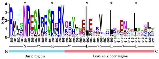 To further study and characterize the homologous conserved domains in CebZIP proteins, a multiple sequence alignment and a weblogo analysis of CebZIP proteins were performed by analyzing the characteristic amino acid sequences of the leucine zipper and basic domains within the bZIP gene family. Similar to other species, CebZIP proteins contain basic domains and leucine zipper, namely, [-N-X7-R/K-] and [-L-X6-L-X6-L-] (Figure 2).