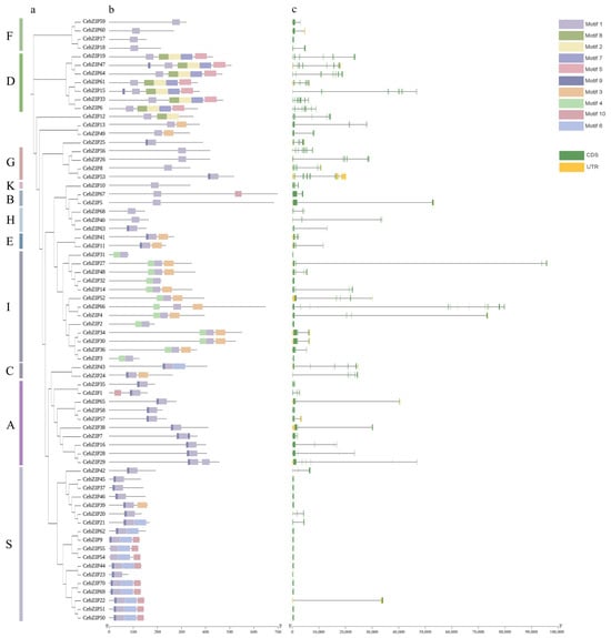 Conserved motif and gene structure analysis of CebZIPs. (a) Phylogenetic tree. (b) Conserved motifs are shown by colored boxes. (c) Exon/intron structure of CebZIPs are displayed by green bars and black lines, respectively.