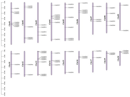 A chromosomal distribution map of CebZIP gene family was generated using Tbtools [34]. The C. ensifolium genome comprises 20 chromosomes, and the 70 CebZIPs are randomly distributed across 18 of these chromosomes, with chromosomes 11 and 18 lacking bZIP genes (Figure 4). Chromosome 13 accommodates the highest number of CebZIP genes (eight), while chromosomes 9, 12, 15, 16, 17, and 19 each contain two genes.