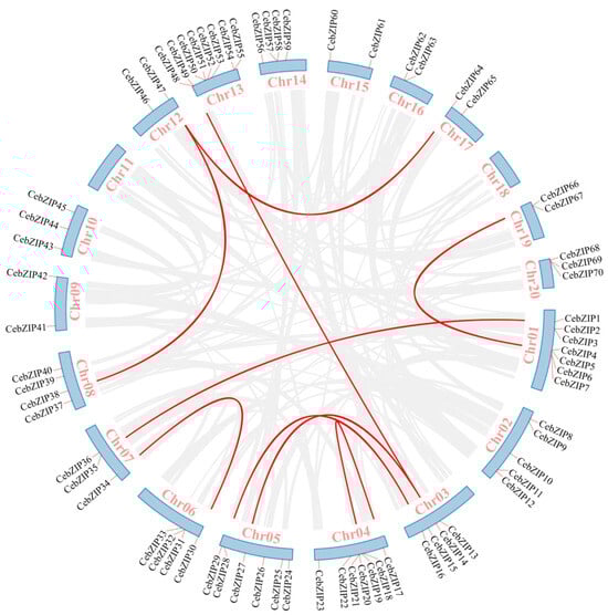 Collinear distribution of CebZIP genes on chromosomes. The 18 chromosomes of C. ensifolium are arranged in a circular blue bar. Red lines connecting chromosomes represent segmentally duplicated genes.
