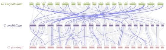 Collinearity analysis of bZIP genes among three orchids. Gray lines indicate all syntenic blocks between C. ensifolium and the other two orchids. The blue lines delineate collinear pairs of bZIPs.