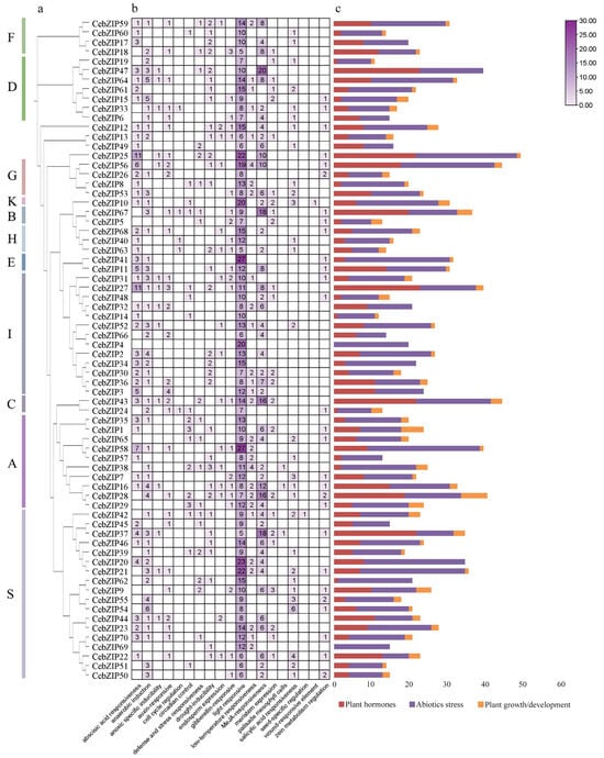 The cis-acting elements of CebZIP gene promoters. (a) Phylogenetic tree. (b) The number of cis-acting elements is shown in boxes. (c) The different colors delineate the main categories of the functional components. The size of the box delineates the number of functional components.