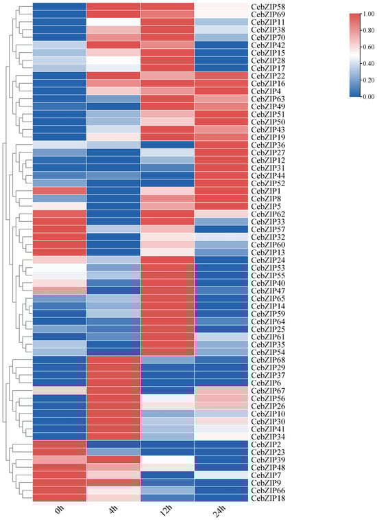 Gene expression patterns can unveil various biological functions in plants. To validate the role of CebZIPs in response to low-temperature stress, we used transcriptome data to examine the expression levels of CebZIPs at 0 h, 4 h, 12 h, and 24 h post treatment with low-temperature stress. Subsequently, we constructed a gene expression heat map (Figure 8). Following low-temperature stress, the expression level of most CebZIP genes changed significantly and exhibited diverse temporal expression patterns, suggesting their distinct regulatory roles in response to low-temperature stress.
