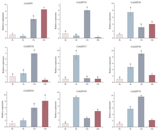 qRT-PCR analysis of nine CebZIP genes in C. ensifolium under low-temperature treatment. Error bars indicate the SD of three biological replicates. Letters delineate significant differences among treatments (p < 0.05, Duncan).