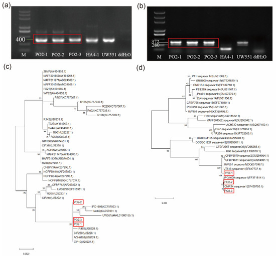 In a previous study, three Ralstonia solanacearum strains were isolated from potato plants with bacterial wilt in the field, named Po2-1, Po2-2, and Po2-3 [31]. We utilized the specific flagellin gene (fliC) of the R. solanacearum for Polymerase Chain Reaction (PCR) testing, using the strains HA4-1 and UW551 as control samples. The results established that the isolated strains (Po2-1, Po2-2, and Po2-3) belong to the species of R. solanacearum (Figure 1a). To confirm the classification of the isolated strains, we employed multiple PCR using specific primers for phylotype. The results revealed the amplification of 372 bp and 280 bp bands, which are specific to phylotype IIB, matching the bands obtained from the phylotype IIB strains UW551 (Figure 1b).