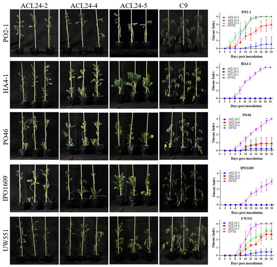 The accession ACL24-2 shows different resistance to R. solanacearum strains.The disease phenotype of wild potato species accession ACL24 inoculated with Ralstonia solanacearum PO2-1 and other four strains, photographed at 14 DPI, the disease index line chart of ACL24 series inoculated with strains on a single plant. The presented data are based on one representative experiment, comprising six plants per treatment. The error bars in the graph indicate standard errors. Three independent biological replicates were performed with similar results.