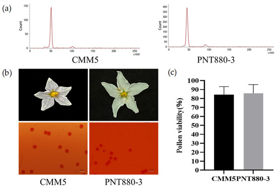 Although the genotypes we screened were resistant to R. solanacearum, we observed that only the PNT880-3 was a plant capable of flowering. CMM5 is a diploid cold-resistant wild potato species S. commersonii [32], which we used as a control to detect the ploidy and pollen vigor of PNT880-3. We detected the ploidy of PNT880-3 by flow cytometry and a similar peak between PNT880-3 and CMM5 (Figure 4a). This result indicated that the PNT880-3 was a diploid wild potato species.