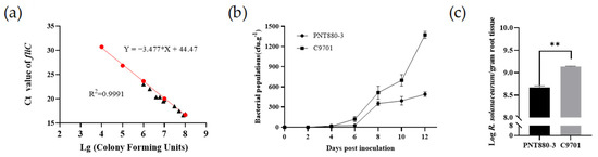 The populations of R. solanacearum in PNT880-3 were inhibited. (a) The Ct values of fliC expression in PO2-1 exhibited a negative correlation with the concentration of the bacterial solution, and the Ct values at different bacterial solution concentrations closely aligned with the standard curve. Red dots are the data for drawing a standard curve, and black triangles represent data for detecting the curve. (b) Quantitative analysis of the bacterial population of the bacterial wilt pathogen was conducted in resistant and susceptible materials 12 days after inoculation. (c) Significant differences in bacterial population were observed within the resistant and susceptible materials on the 12th day following plant inoculation. Error bars represent standard errors and two asterisks (**) = p < 0.01 by t-test.