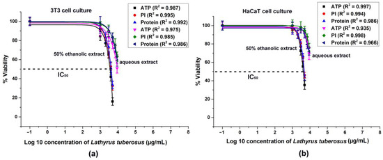 We conducted a multiparametric viability assay with one-step extraction, following the methodology outlined in our previously published study, without any modifications [72]. The aim was to assess the potential toxicity of 50% (v/v) ethanolic and aqueous leaf extracts. of L. tuberosus. The extracts were tested at concentrations ranging from 100 to 5000 µg/mL (ethanolic) and 1000 to 9000 µg/mL (aqueous). The concentration of ethanolic solvent was capped at 1.5% (v/v) in the wells, a level that does not affect cell viability. In summary, 3T3 and HaCaT cells were exposed to various concentrations of plant extracts for 24 h. Following treatment, ATP levels were measured from cell lysates using the bioluminescence method. The nucleic acid content was analyzed through PI staining, while total levels of intracellular protein were quantified after fluorescent derivatization with fluorescamine. The dose–response curves were calculated from the measured data using OriginLab Pro software (version 2016, OriginLab Corporation, Northampton, MA, USA) after the DoseResp fitting.