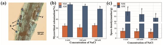 AMF colonization of poplars. (a) Mycorrhiza microstructure (arrows: S, spores; V, vesicles). (b) Mycorrhizal colonization rate of poplar under different levels of salt stress. (c) Spore density in rhizosphere soil of poplars under different levels of salt stress. NM, non-inoculated treatment; AM, AM-inoculated treatment. Different letters on top of the bars indicate significant differences (p < 0.05). All data are presented as means ± standard errors.