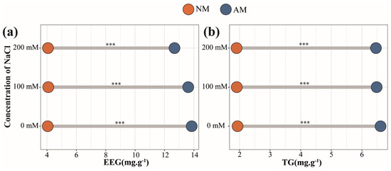 Glomalin−related soil protein (GRSP) contents in poplar rhizosphere soil. (a) EEG contents under salt stress. (b) TG contents under salt stress. NM, non−inoculated treatment; AM, AM−inoculated treatment. ***, p < 0.001. All data are presented as means ± standard errors.