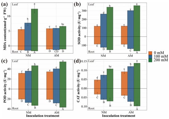 Effect of AMF inoculation on antioxidation under salt stress. (a) MDA content of poplar. (b) SOD activity of poplar. (c) POD enzyme activity of poplar. (d) CAT enzyme activity of poplar. NM, non−inoculated treatment; AM, AM−inoculated treatment. The lower case at the top (Leaf) and the capital letters at the bottom (Root) of the bar chart indicate significant differences (p < 0.05). All data are presented as means ± standard errors.