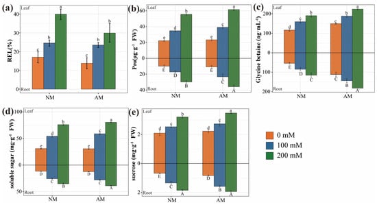 Effect of AMF inoculation on osmotic balance of poplar under salt stress. (a) Leaf REL of poplar. (b) Pro content in poplar. (c) GB concentration of poplar. (d) Soluble sugar content of poplar. (e) Sucrose content of poplar. NM, non−inoculated treatment; AM, AM inoculated treatment. The lower case at the top (Leaf) and the capital letters at the bottom (Root) of the bar chart indicate significant differences (p < 0.05). All data are presented as means ± standard errors.