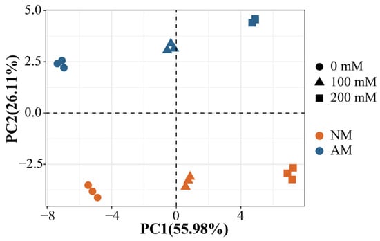 To investigate whether plants exhibit different physiological response patterns to salt stress and mycorrhizal inoculation, principal component analysis (PCA) was performed using the experimental dataset. PCA reduces the dimensions of all variables to the most representative dimensions, transforming large datasets into representative scores for each sample. The PCA results revealed that principal component 1 (PC1) and principal component 2 (PC2) accounted for 55.98% and 26.11% of the variance, respectively, collectively explaining 82.09% of the total variance (Figure 6). An increasing trend in salt concentration was observed along PC1, while mycorrhizal inoculation showed distinct separation along PC2.