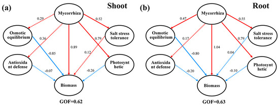 Correlations among mycorrhiza, salt tolerance, oxidation resistance, photosynthesis, infiltration, and biomass according to partial least squares path modeling. (a) Shoot. (b) Root. Blue and red arrows indicate positive and negative path coefficients, respectively, and solid and dashed lines indicate significant and nonsignificant path coefficients, respectively (p < 0.05).
