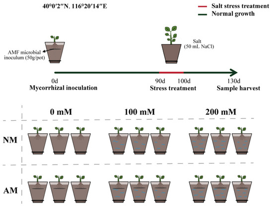 The experiment was conducted from June 2022 to October 2022 at the Sunlight Greenhouse of the Sanqingyuan Nursery of Beijing Forestry University (Figure 8). We chose healthy and similar 84K tissue culture seedlings with a plant height of 7.74 cm and a four−leaf stage. The topsoil (0–20 cm) and peat were mixed in a 2:1 ratio, sieved through a 20−mesh sieve, and added to pots with an outer diameter of 26.5 cm at a weight of 4.5 kg per pot. At the time of transplantation, AMF microbial inoculum, at a rate of 50 g per pot, was added at 2/3 of the height of the culture medium to ensure contact with the root system. The experiment consisted of two factors: (1) inoculation (AM) and non−inoculation (NM) treatments and (2) varying levels of salt stress (S0: 0 mM, S1: 100 mM, and S2: 200 mM). For each treatment, we had 12 replicates, resulting in a total of 2 × 3 × 12 = 72 pots. Watering was managed according to regular cultivation practices without exogenous nutrient solution treatment. After 90 days of transplantation, salt stress treatments were implemented through the daily addition of 50 mL of NaCl solution for 10 consecutive days at three concentration levels. After completing the stress treatments, the plants were further managed for 30 days before harvest.