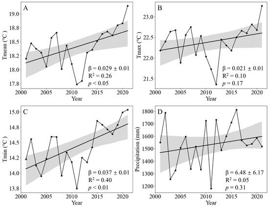 Variations of annual climate factors in the southern hilly region of China during 2001–2021. (A) Average temperature (Tmean). (B) Daily maximum temperature (Tmax). (C) Daily minimum temperature (Tmin). (D) Total annual precipitation. Shading denotes 95% prediction intervals.