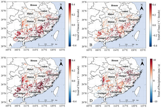 Spatially, the increase of Tmean was extensive, being observed across more than 99.5% of the study area, with 59.7% of the pixels showing significant increases (p < 0.05) (Figure 3A). Across the entire study area, the southern regions of Guangxi, Guangdong, Fujian, and Jiangxi provinces experienced the highest rates of temperature increase, while the provinces situated further north exhibited lower rates of increases in Tmean (Figure 3A). It is noteworthy that only 9.5% of Tmax shows a significant increasing trend, whereas the proportion of Tmin exhibiting a significant increase reaches 78.7% (Figure 3B,C). This result indicates a pronounced asymmetry in diurnal temperature changes in the study area, with the majority of the rise in Tmean from 1982 to 2015 being driven by an increase in nighttime temperatures. Similarly to the spatial pattern of Tmean, areas with a significant increase in both Tmax and Tmin are predominantly located in lower-latitude regions (Figure 3B,C). Additionally, during the same period, there is no significant decreasing trend in Tmean, Tmax, and Tmin in the study area. For precipitation, although 92.7% of the trends show an upward trajectory, these are only statistically significant (p < 0.05) for 4.8% of the region, primarily in areas of the southeastern part of Anhui Province and the northwestern part of Fujian Province (Figure 3D). No significant downward trend in precipitation was found anywhere in the study area over the same period (Figure 3D).