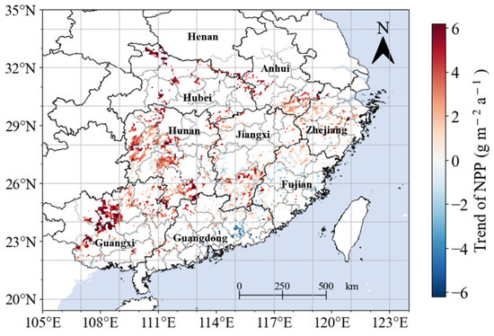 Spatially, the regions exhibiting a rising trend in annual NPP accounted for 77.9% of the overall study area. Notably, 39.5% of individual pixels displayed a statistically significant increase (p < 0.05), as illustrated in Figure 5. This significant increasing trend was primarily concentrated in Hubei Province, Hunan Province, Guangxi Province, the southern part of Anhui Province, the southern part of Jiangxi Province, and the central part of Zhejiang Province (Figure 5, Table 1), These findings suggest a significant ecological shift or enhancement in vegetation productivity within these specified regions (Figure 5). Conversely, there was a small number of pixels (2.5%) with statistically significant decreasing trends in NPP (p < 0.05). These were predominantly located in the east of Guangdong Province and in central Fujian Province (Figure 5, Table 1). At the provincial level, the proportion of pixels with a significant increasing trend far exceeded that of those with a significant decreasing trend in all the provinces except for Guangdong and Fujian (Table 1).